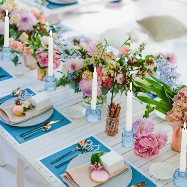 Elegant short glass taper candle holder with boho ribbed design. Perfect for weddings, dinner parties, or table centerpieces, adding a touch of charm and warmth to any setting.