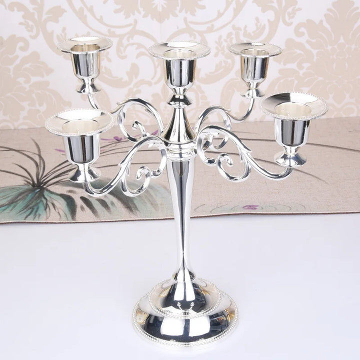 Elegant retro-style 5-arm metal candle holder available in silver, gold, black, or bronze. Perfect for romantic dinners, weddings, hotels, or home décor, adding a classic and luxurious touch.