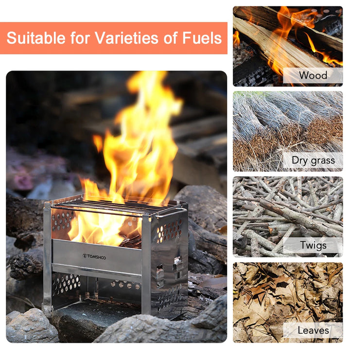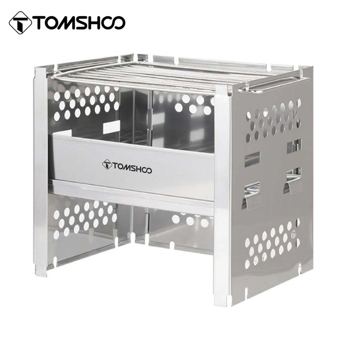 Tomshoo outdoor portable wood-burning stove with built-in BBQ grill and firewood bracket. Ideal for camping, picnics, and outdoor cooking, offering a durable and compact solution for grilling and heating.